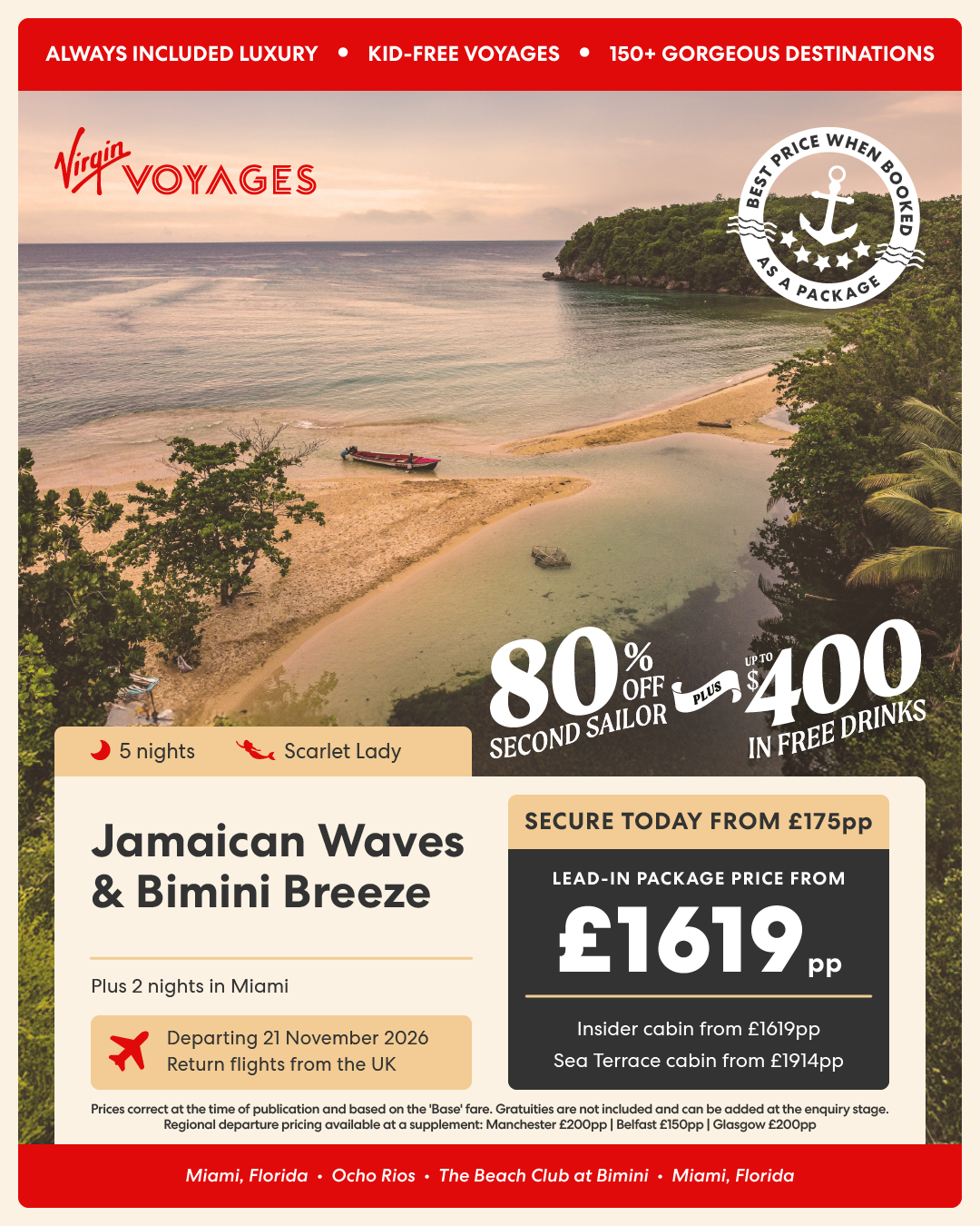 7 night Jamaican Waves & Bimini Breeze + 2 night pre-cruise stay in Miami - 21 November 2026