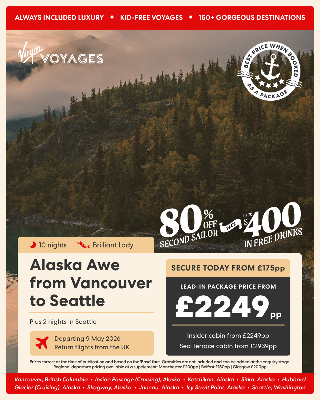 10 night Alaska Awe from Vancouver to Seattle + 2 night pre-cruise stay in Seattle - 9 May 2026