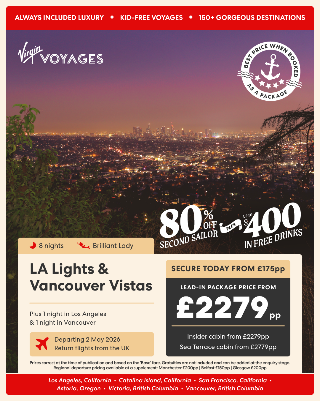 10 night LA Lights and Vancouver Vistas + 1 night pre-cruise stay in Los Angeles and 1 night post cruise stay in Vancouver - 2 May 2026